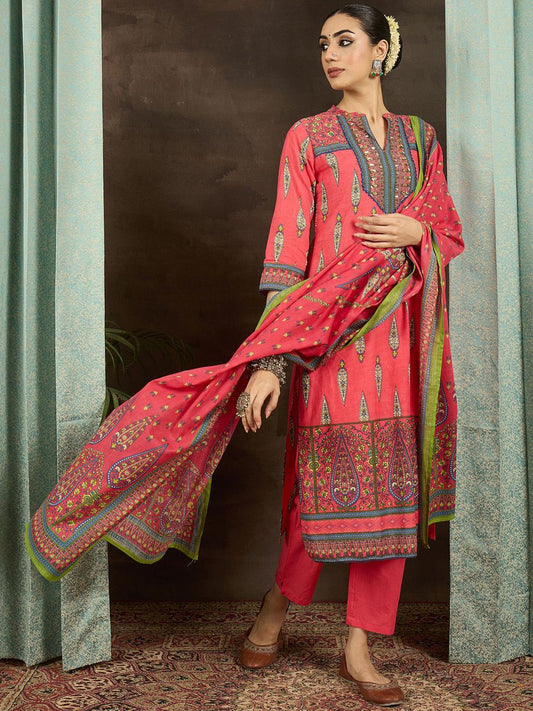Dhiyona IE Ethnic Motifs Printed Pure Cotton Straight Kurta With Trousers & Dupatta