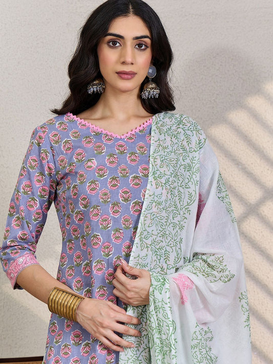 Dhiyona IE Women Floral Printed Cotton A-Line Kurta with Trousers & Dupatta