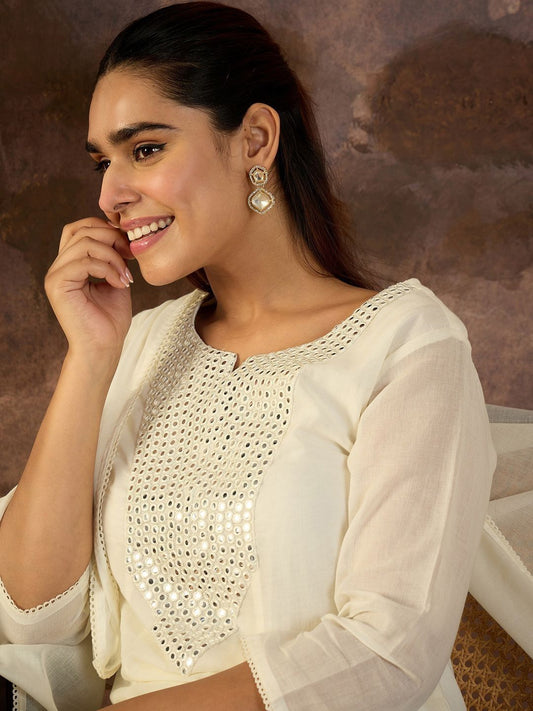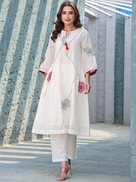Dhiyona IE Floral Embroidered Mirror Work Tie-Up Neck Pure Cotton A-Line Kurta With Trousers