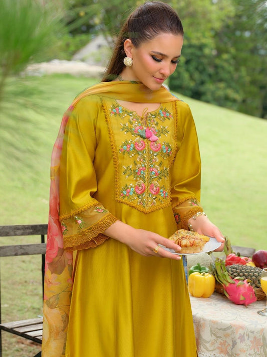 Dhiyona IE Floral Yoke Design Notch Neck Thread Work A-Line Kurta & Dupatta with Trousers