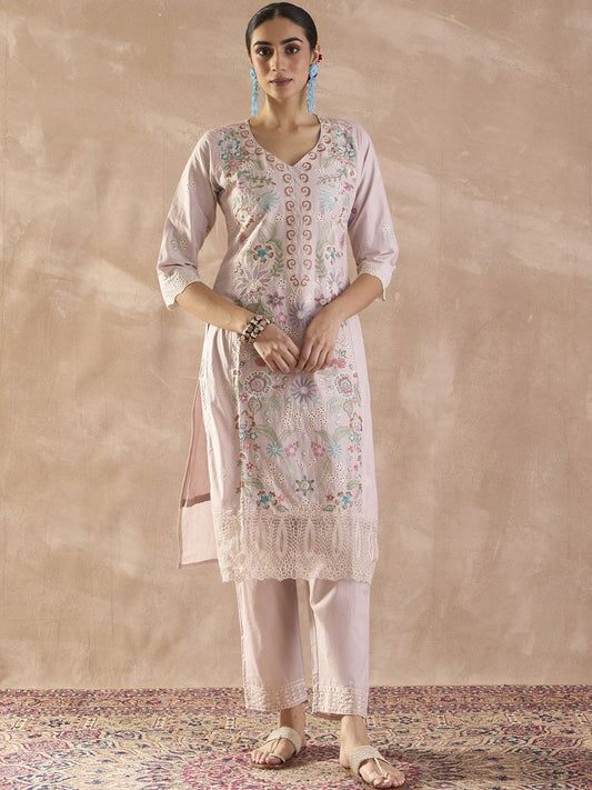 Dhiyona IE Floral Embroidered V-Neck Thread Work Pure Cotton Kurta With Trousers & Dupatta