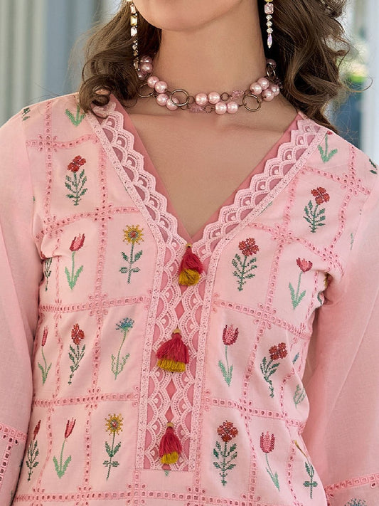 Dhiyona IE Floral Printed Thread Work Pure Cotton Kurta With Palazzos