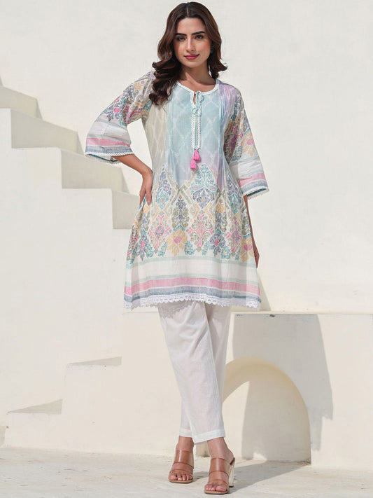 Dhiyona IE Floral Printed Notch Neck A Line Pure Cotton Kurta With Trousers
