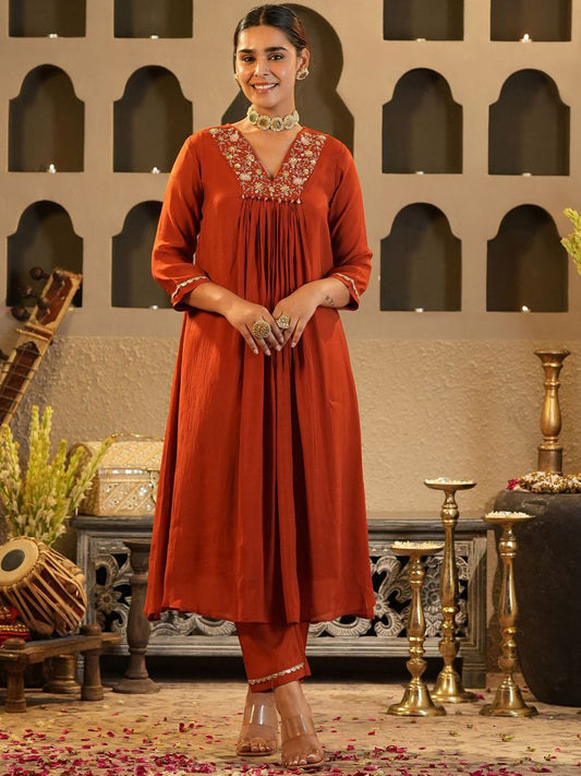 Dhiyona IE Floral Yoke Design V Neck Zari Chanderi Silk A-Line Kurta & Trousers