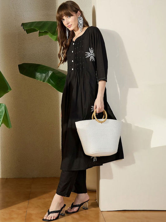 Dhiyona IE Women Ethnic Motifs Embroidered Pleated Thread Work Pure Cotton Kurta with Trousers