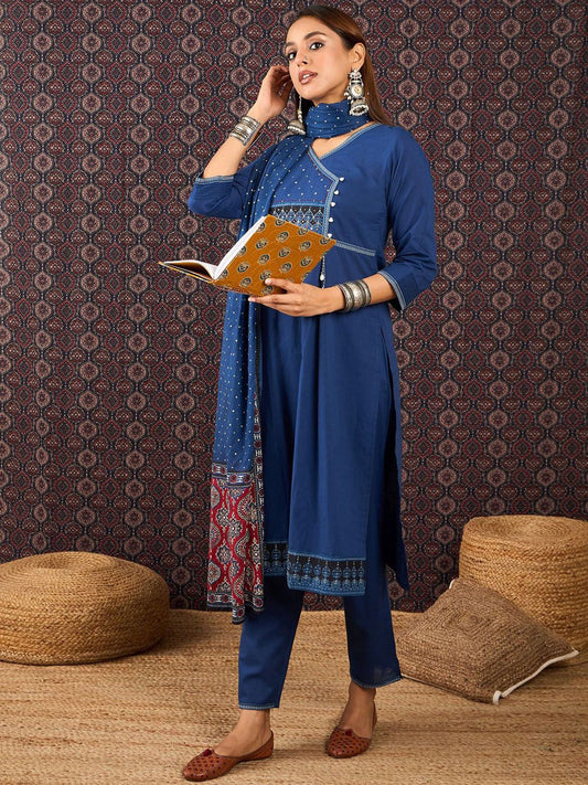 Dhiyona IE Ethnic Motifs Thread Work Pure Cotton A-Line Kurta & Trousers with Dupatta