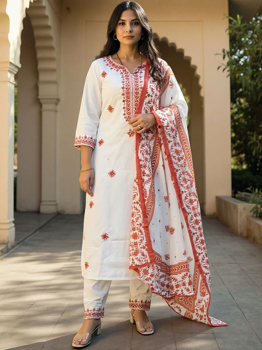 Dhiyona IE Floral Embroidered Thread Work Pure Cotton Straight Kurta With Trousers & Dupatta