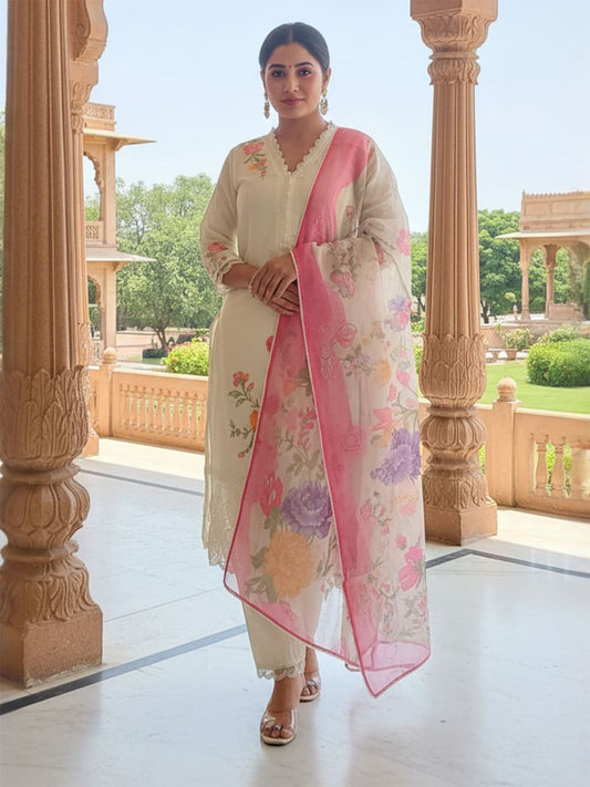 Dhiyona IE Floral Embroidered V-Neck Thread Work Pure Cotton Kurta With Trousers & Dupatta
