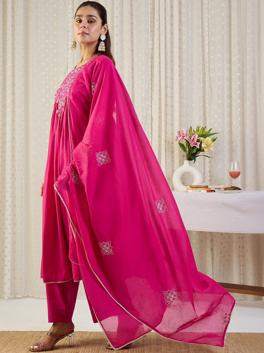 Dhiyona IE Embroidered Notch Neck Thread Work Pure Cotton Kurta With Trousers & Dupatta