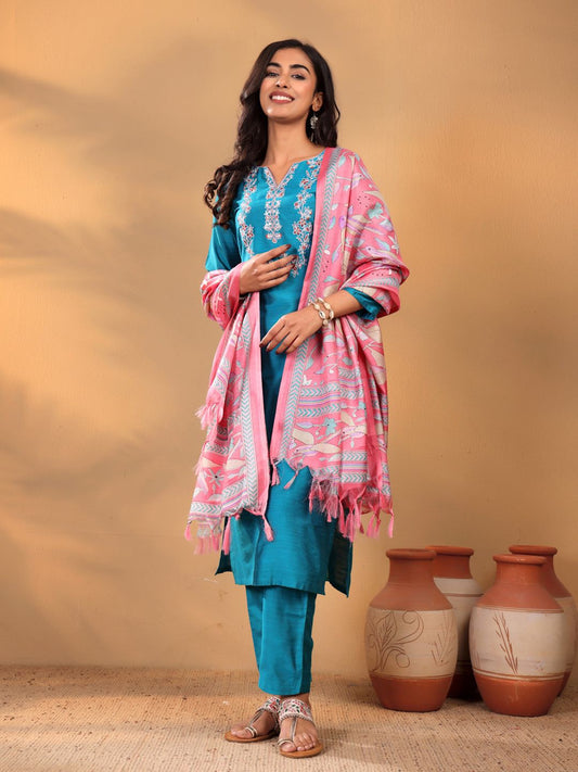 Dhiyona VA Women'sTurquoise Blue Floral Yoke Design Thread Work Kurta With Trouser & Dupatta