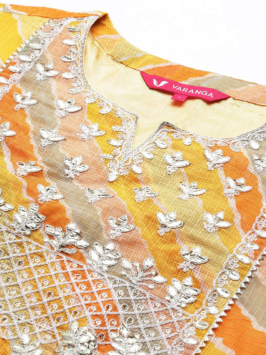 Buy 2 Get 1 FreeVendor:Dhiyona VADhiyona VA Women's Yellow Leheriya Printed Gotta Patti Chanderi Cotton Kurta with Sharara & With Dupatta