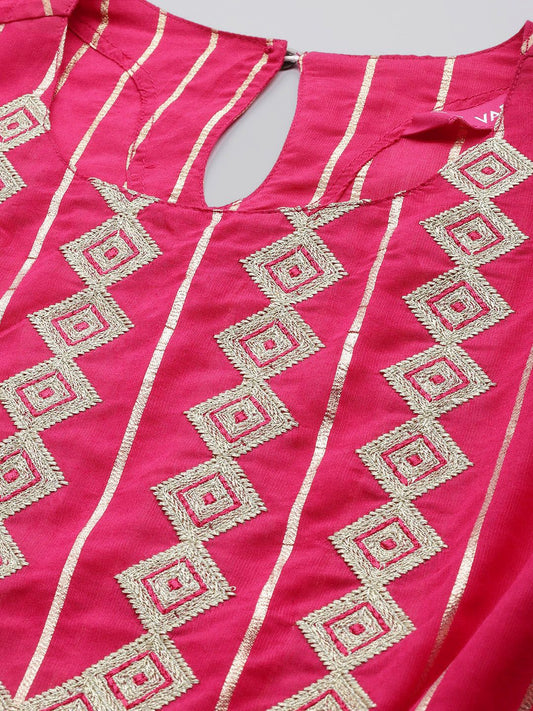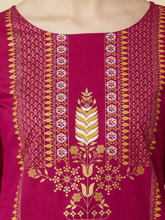Buy 2 Get 1 FreeVendor:Dhiyona VADhiyona VA Women's Fuchsia Pink & Golden Floral Print Cotton Kurta with Palazzos & Dupatta