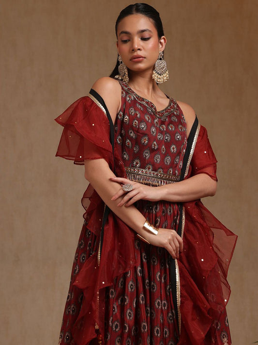 Dhiyona SO Women's Floral Printed Mirror Work Chinon Anarkali Kurta With Churidar & Dupatta