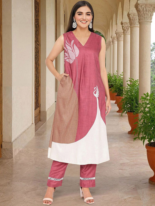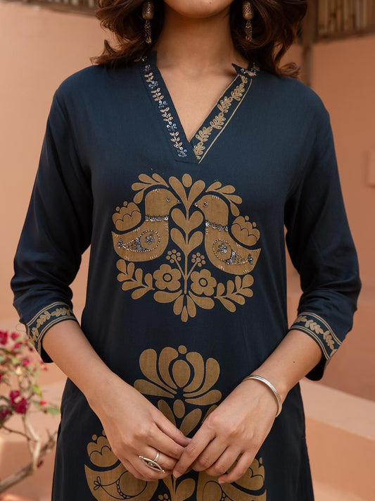 Dhiyona IS Women's Ethnic Motifs Printed V-Neck A-Line Kurta With Trousers