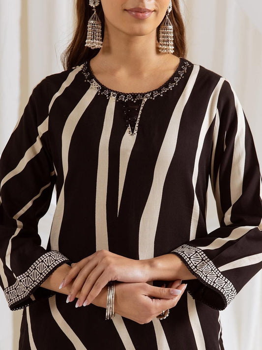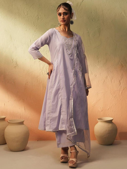Dhiyona IS Women's Striped Embroidered Gotta Patti Pure Cotton A-Line Kurta With Trousers And Dupatta