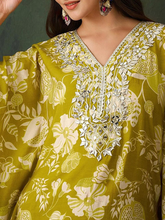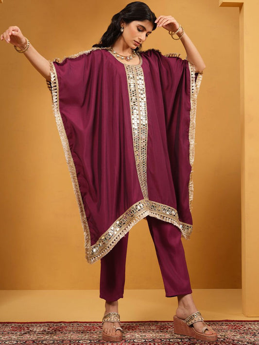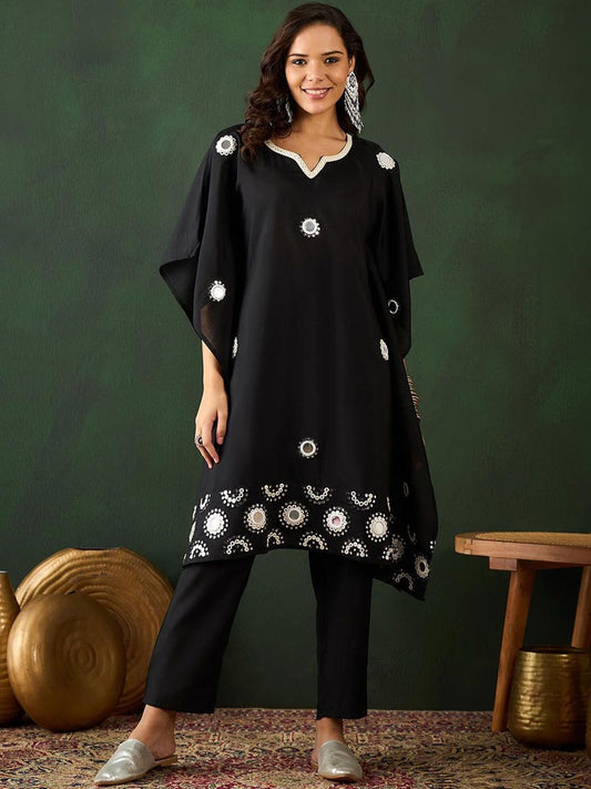 Dhiyona IS Women's Women Ethnic Motifs Print Regular Mirror Work Kaftan Kurta with Trousers