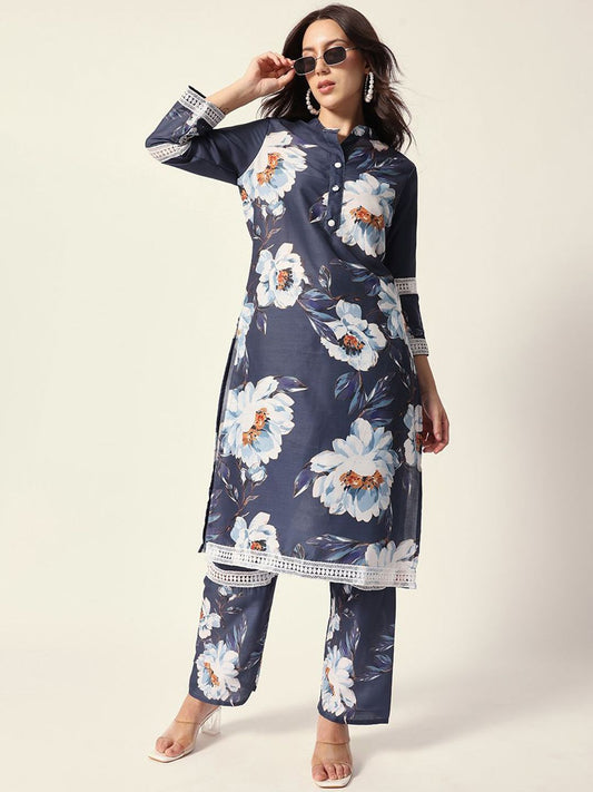 Dhiyona IS Women's Floral Printed Mandarin Collar Straight Kurta With Trousers
