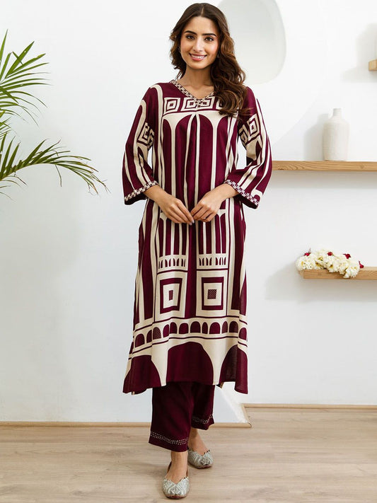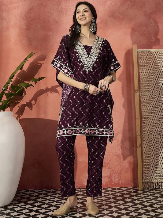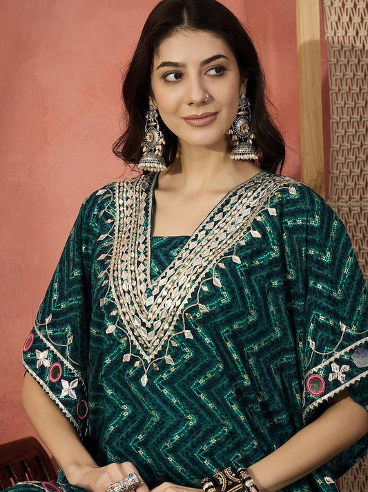 Dhiyona IS Women's Geometric Printed V-Neck Gotta Patti Kaftan Kurti With Trousers