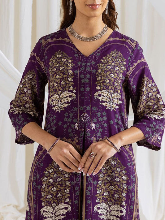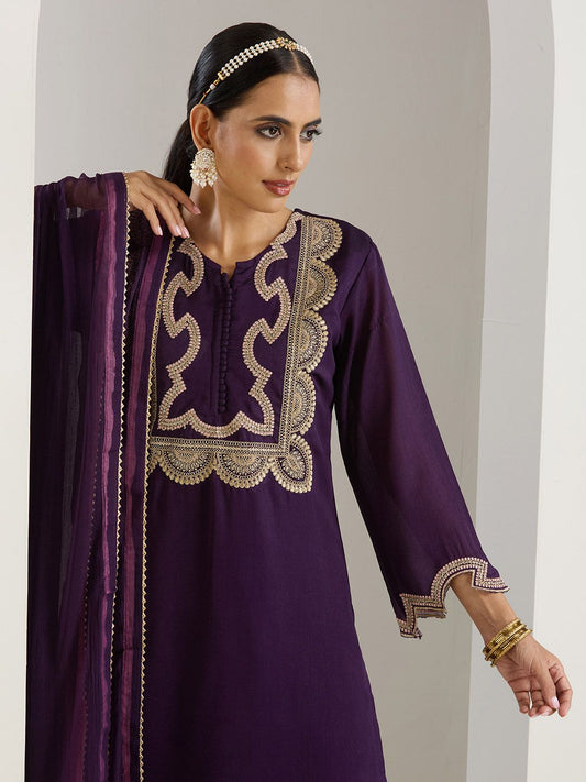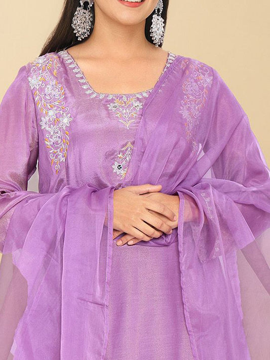 Dhiyona IS Women's Purple Ethnic Motifs Embroidered Chinon Straight Kurta With Sharara & Dupatta