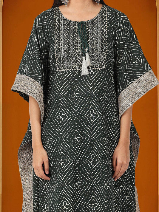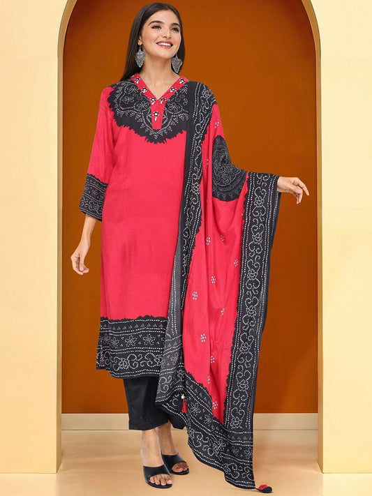Dhiyona IS Women's Bhandani Printed V-Neck Straight Kurta With Trousers And Dupatta