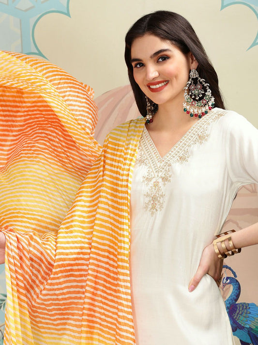 Dhiyona IS Women's Floral Yoke Design Thread Work Silk Chiffon Straight Kurta with Trousers & Dupatta