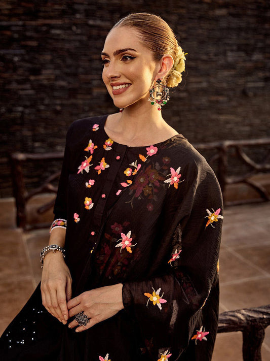 Dhiyona IE Floral Embroidered V-Neck Sequinned Cotton Straight Kurta With Trousers & Dupatta