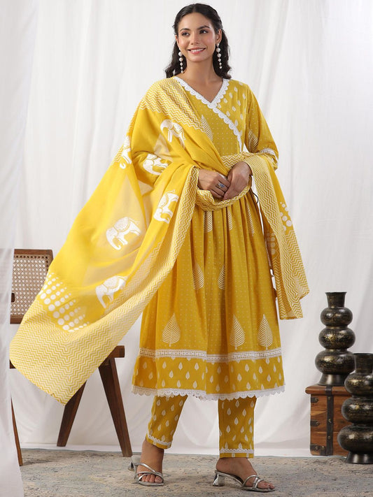 Dhiyona IS Women's Ethnic Motifs Printed Angrakha Thread Work Pure Cotton Kurta with Trousers & Dupatta