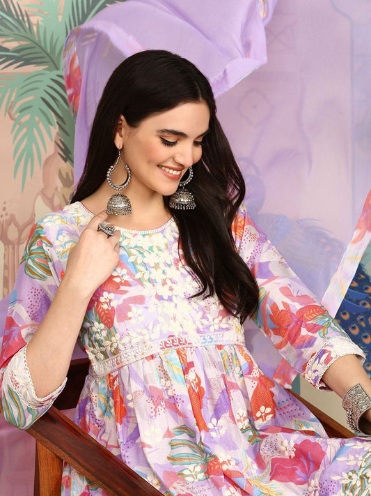Dhiyona SN Women's Floral Printed Pure Cotton Anarkali Kurta with Palazzo & Dupatta