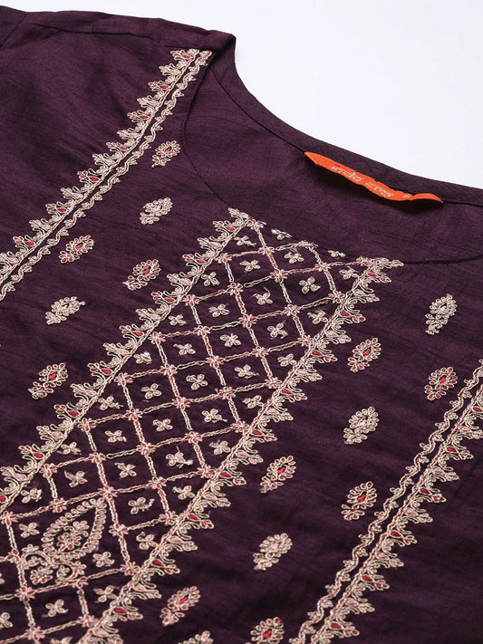 Dhiyona IE Women Purple Ethnic Motifs Yoke Design Thread Work Kurta with Trousers & Dupatta