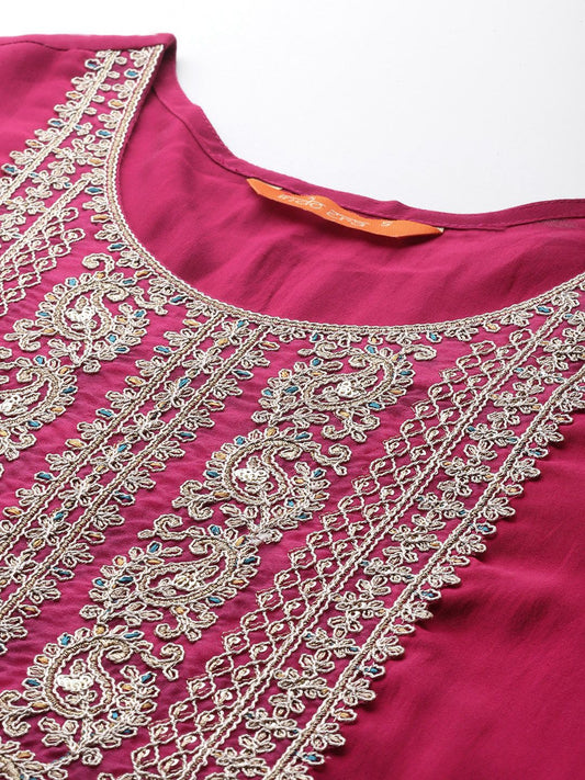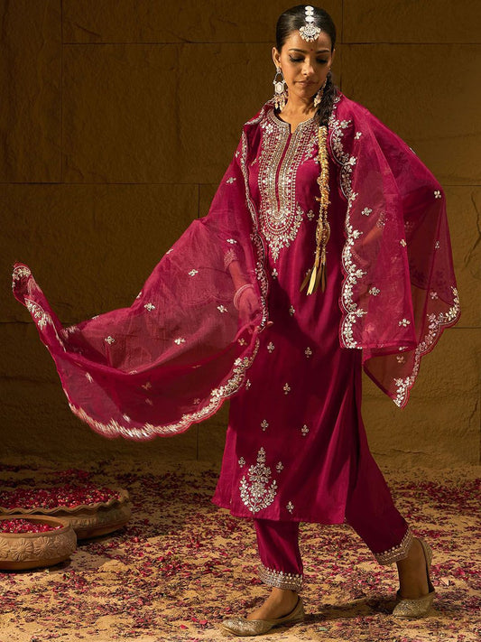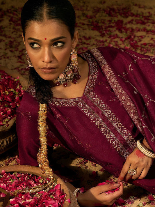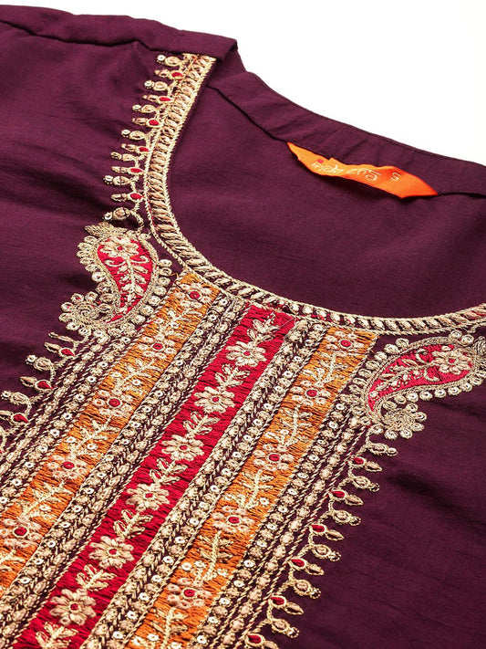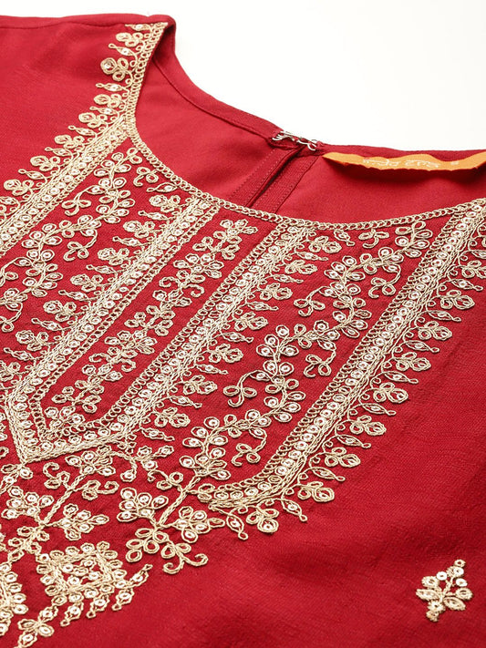Dhiyona IE Maroon Floral Embroidered V-Neck Straight Kurta with Trousers & Dupatta