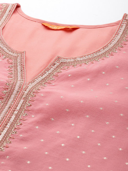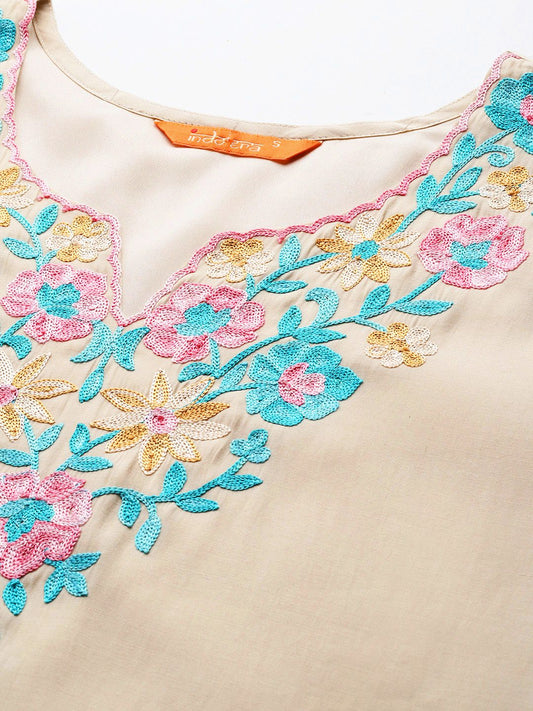 Dhiyona IE Floral Embroidered Notched Neck Pure Cotton Straight Kurta With Trousers
