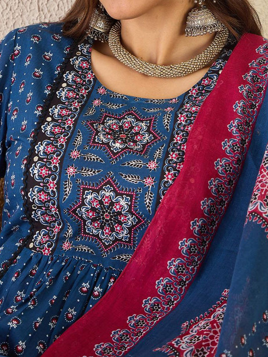 Dhiyona IE Ethnic Motifs Printed Round Neck A line Pure Cotton Kurta with Trousers & Dupatta