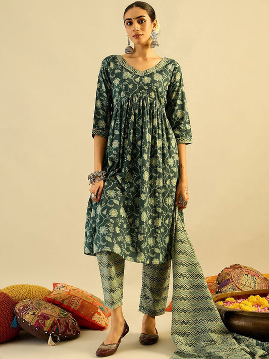 Dhiyona IE Green Floral Printed V-Neck Pure Cotton A-Line Kurta with Trousers & Dupatta