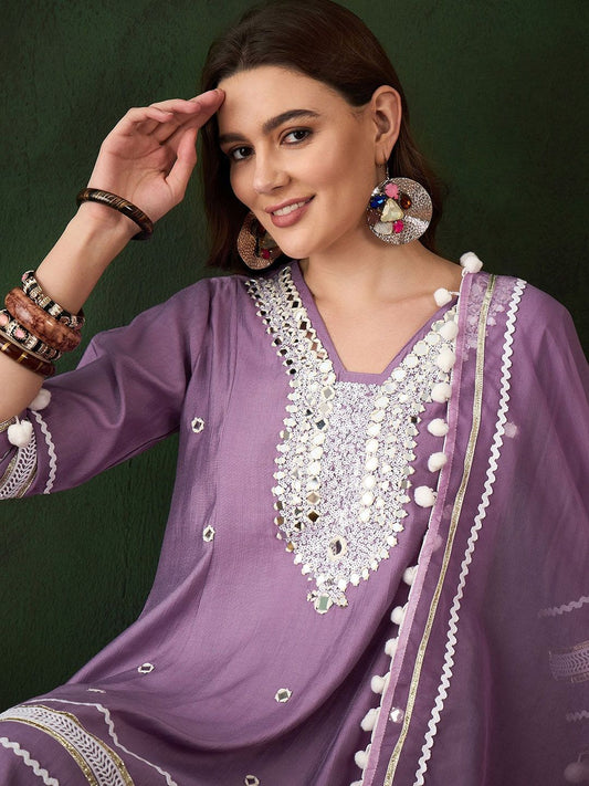 Dhiyona SN Women's Purple Floral Embroidered Mirror Work A-Line Kurta With Trousers & Dupatta