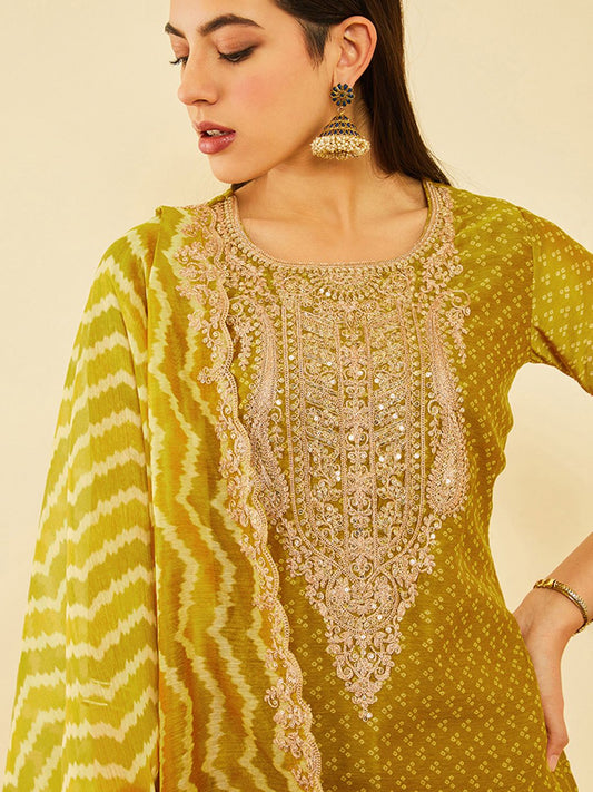 Dhiyona SO Women's Bandhani Printed Thread Work Chanderi Silk Straight Kurta & Trousers With Dupatta