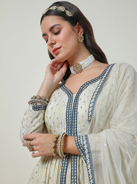 Buy 2 Get 1 FreeVendor:Dhiyona SODhiyona SO Women's Alina Cut Beige Embroidered V-Neck Thread Work Tissue Anarkali Kurta With Palazzos & Dupatta