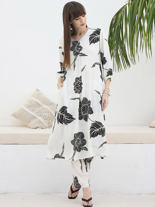 Dhiyona IE Floral Printed V-Neck Pure Cotton Kurta With Trousers