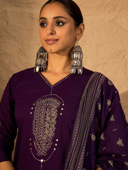 Dhiyona IE Embroidered Notch Neck Thread Work Pure Cotton Kurta With Trousers & Dupatta
