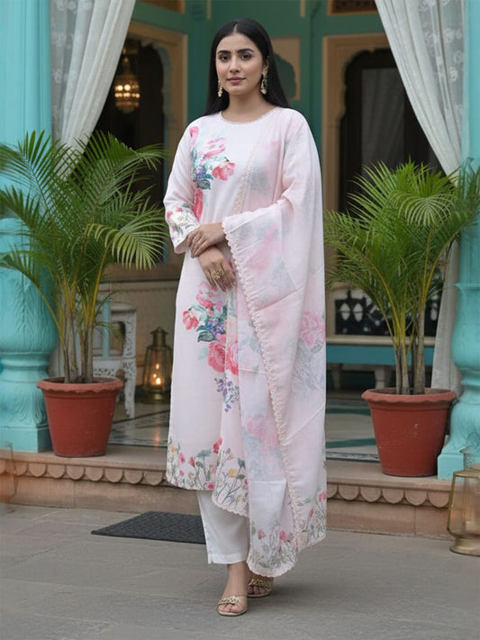 Dhiyona IE Floral Printed Linen Straight Kurta With Trousers & Dupatta
