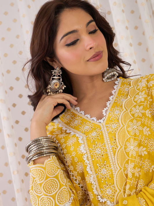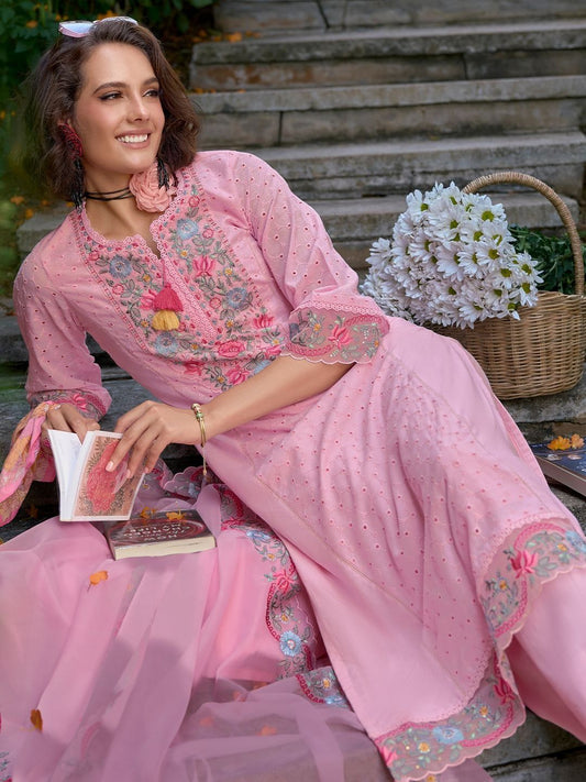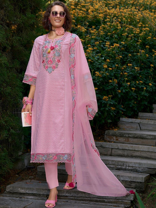 Dhiyona IE Floral Embroidered & Embellished Pure Cotton Kurta with Trousers & Dupatta