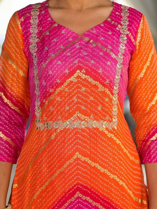 Buy 2 Get 1 FreeVendor:Dhiyona VADhiyona VA Women'sBandhani Printed Regular Gotta Patti Kurta with Trousers & With Dupatta