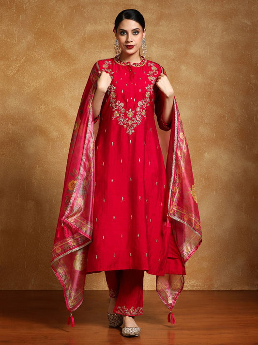 Dhiyona VA Women'sEthnic Motifs Embroidered Dupion Silk Kurta With Trousers & With Dupatta