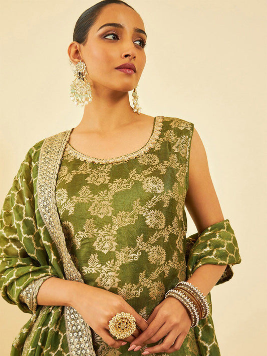 Dhiyona SO Women's Ethnic Motifs Woven Design Zari Straight Kurta With Trousers & Dupatta