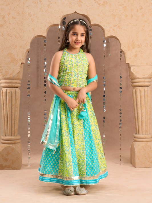 Jaipur Girls Green Cotton Lehanga and Choli with Dupata Ethnic Set
