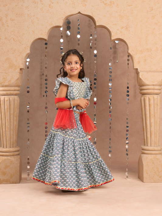 Jaipur Girls Grey Cotton Lehanga and Choli with Dupata Ethnic Set