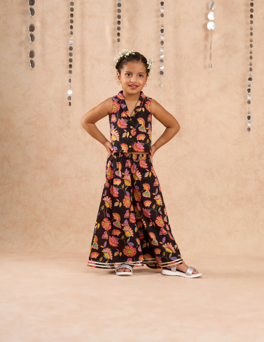 Jaipur Girls Black Cotton Top with Pant Co-ordinate Ethnic Set