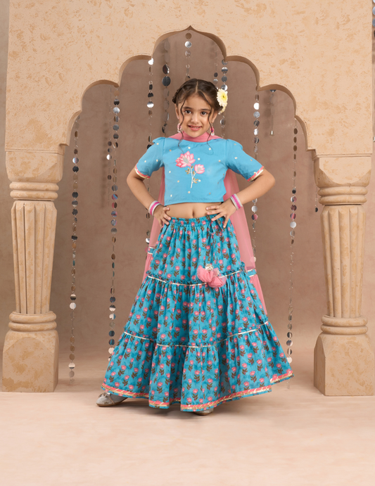Jaipur Girls Blue Cotton Lehanga and Choli with Dupata Ethnic Set
