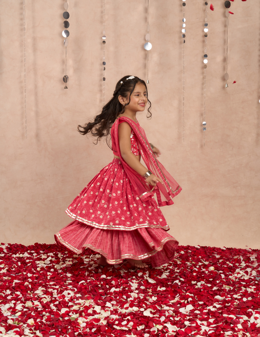 Jaipur Girls Red Cotton Lehanga and Choli with Dupata Ethnic Set