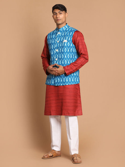 Men's Maroon Cotton Blend Straight Jacket Kurta and Pyjama Set