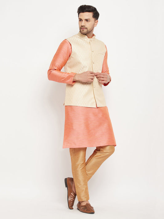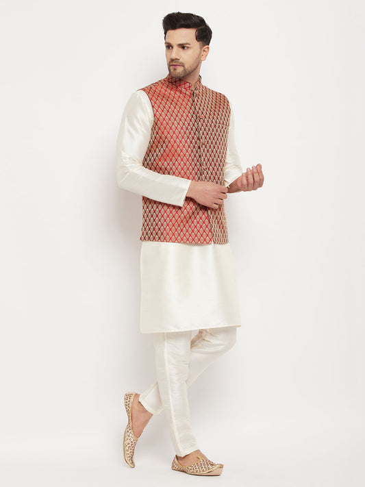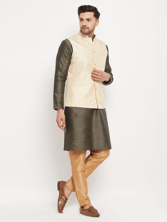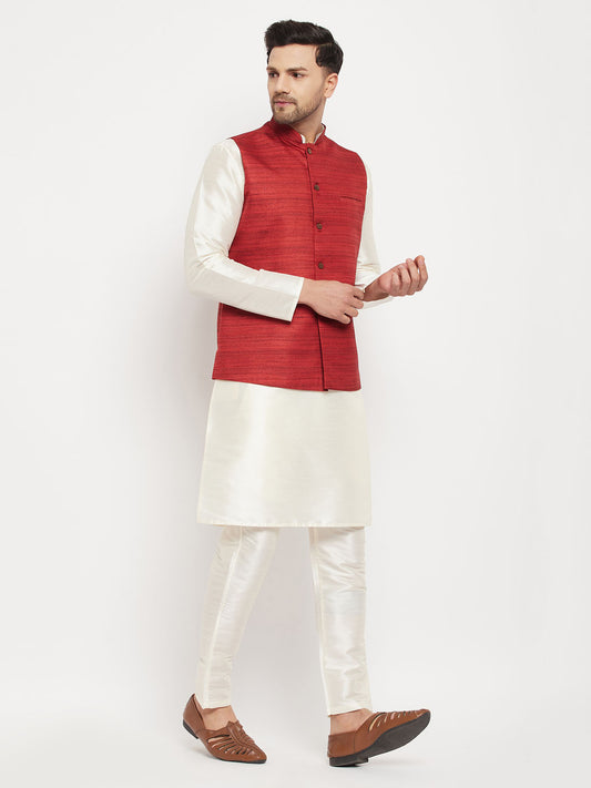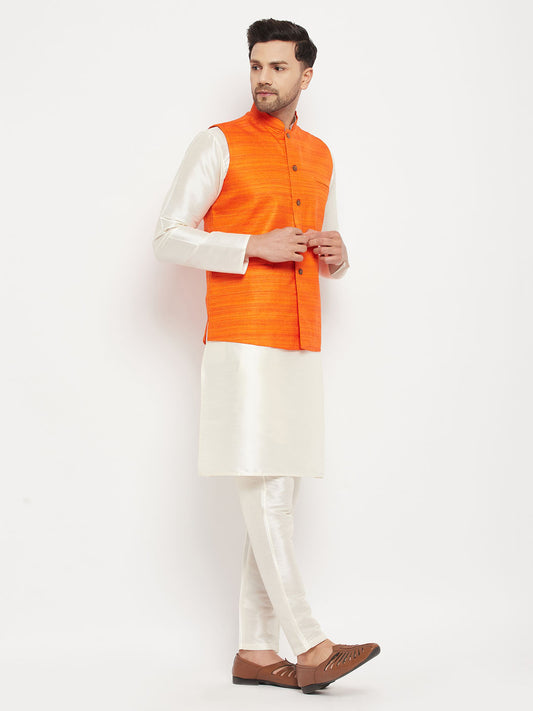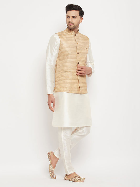 Men's Cream Silk Blend Straight Jacket Kurta and Pyjama Set